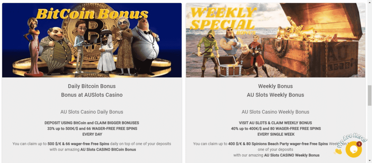 A Auslots oferece aos novos jogadores um bônus de 100% até € 150 para serem usados em conjunto com seu primeiro depósito para fazer apostas. O valor mínimo do depósito é de US $ 20 e o valor do bônus se aplica apenas à seção de cassino.