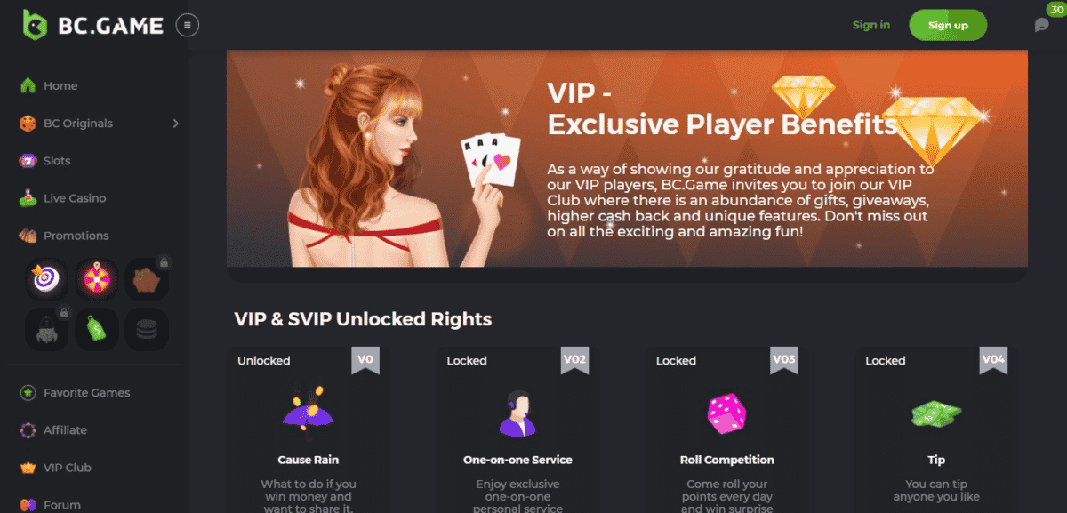 Como muitos cassinos hoje em dia, a BC Games organiza um clube VIP projetado para recompensar os jogadores que apostam grandes somas de dinheiro. Ao apostar com dinheiro real nos jogos do BC, você receberá pontos que podem ser acumulados para progredir para níveis mais altos. Cada apostado de US $ 1 oferece 1 ponto ao XP dos usuários.