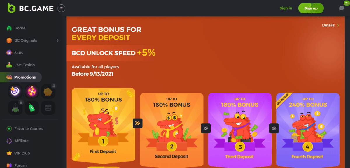 O BC Games oferece alguns bônus de partida em seus primeiros depósitos para fazer seu dinheiro ir o mais longe possível. Após o registro, você terá um bônus de correspondência 100% único em seu primeiro depósito. No entanto, isso deve ser usado na primeira hora ou expirará.