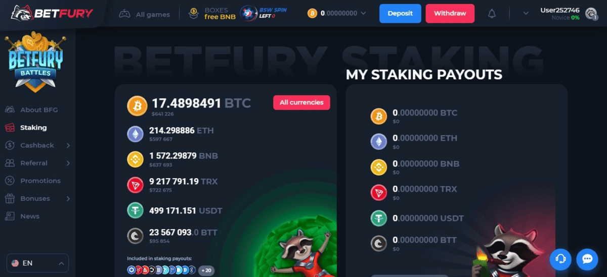 Um dos maiores pontos de venda de Betfury é a capacidade fácil de ganhar dividendos através de seus tokens BFG. Toda vez que você faz uma aposta, alguns tokens BFG são adicionados automaticamente. Ao segurar ou "apostar" nesses BFGs, você obtém uma parte do lucro, proporcional a quantos tokens você possui. Então, quanto mais você toca, maior parte do lucro que receberá!