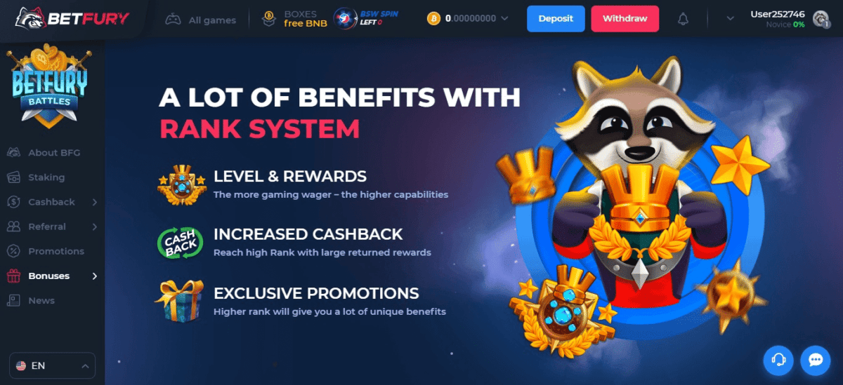 Como mencionado acima, o Betfury possui um sistema de classificação para recompensar usuários mais fiéis. Você não apenas obtém acesso a uma porcentagem maior de reembolso, mas também tem acesso a promoções mais exclusivas, apostas mais altas, suporte VIP e também um bônus atrevido de classificação do MBTC toda vez que você subir de nível. Quanto mais regularmente você joga, e maiores são suas apostas, mais rápido você crescerá e manterá sua classificação.
