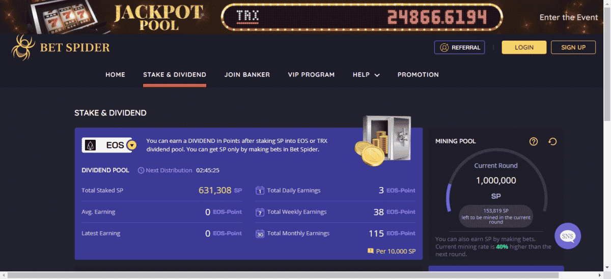 Como a maioria das cripto-casos, o BetSpider permite que você atire alguns de seus pontos para minerar EOS ou TRX, aumentando seus lucros. Quando você joga no BetSpider, você pode ganhar pontos SP. Esses pontos de SP podem ser apostados. Você só pode ganhar pontos de SP apostando, por isso, se você quiser muito minerar, não deixe de jogar muitos jogos! Retornos mensais em média 5.000 EOS e 258.000 TRX, fazendo desta uma maneira muito valiosa de ganhar dinheiro.