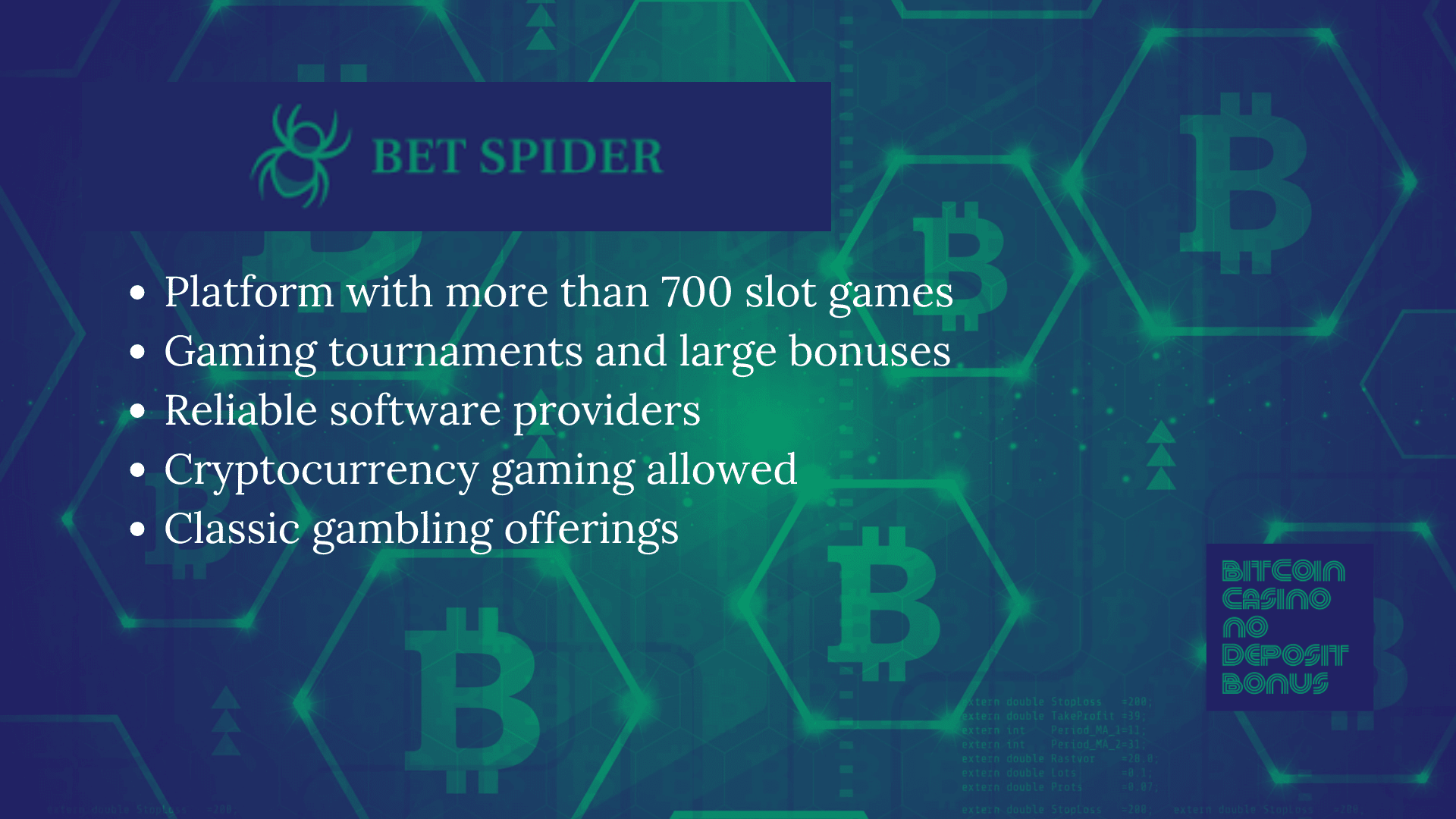 A Betspider é um novo cassino criptográfico que apresenta jogos de tabuleiro clássicos e tradicionais, juntamente com novos e emocionantes jogos de slot. Ele usa moedas EOS e TRX e também pode apostar em sua criptomoeda para extrair mais moedas. Você também tem a opção de investir no esquema "banqueiro", o que significa que você faz uma parte dos lucros do cassino.