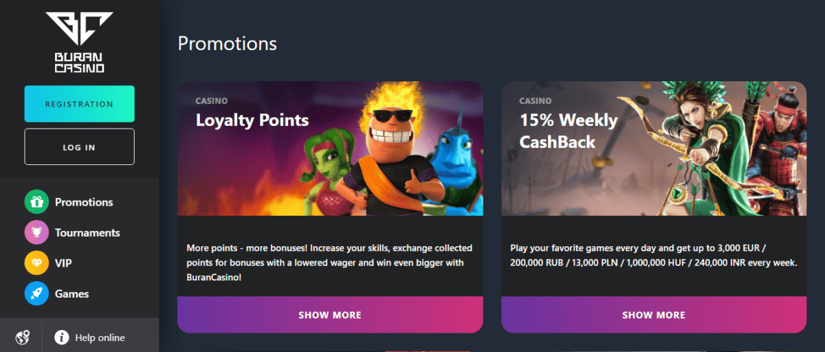Os jogadores podem acessar um bônus semanal de recarregar do Buran Casino, que fornece 50 rodadas gratuitas como uma recompensa extra quando você faz um mínimo de € 20 depósito.