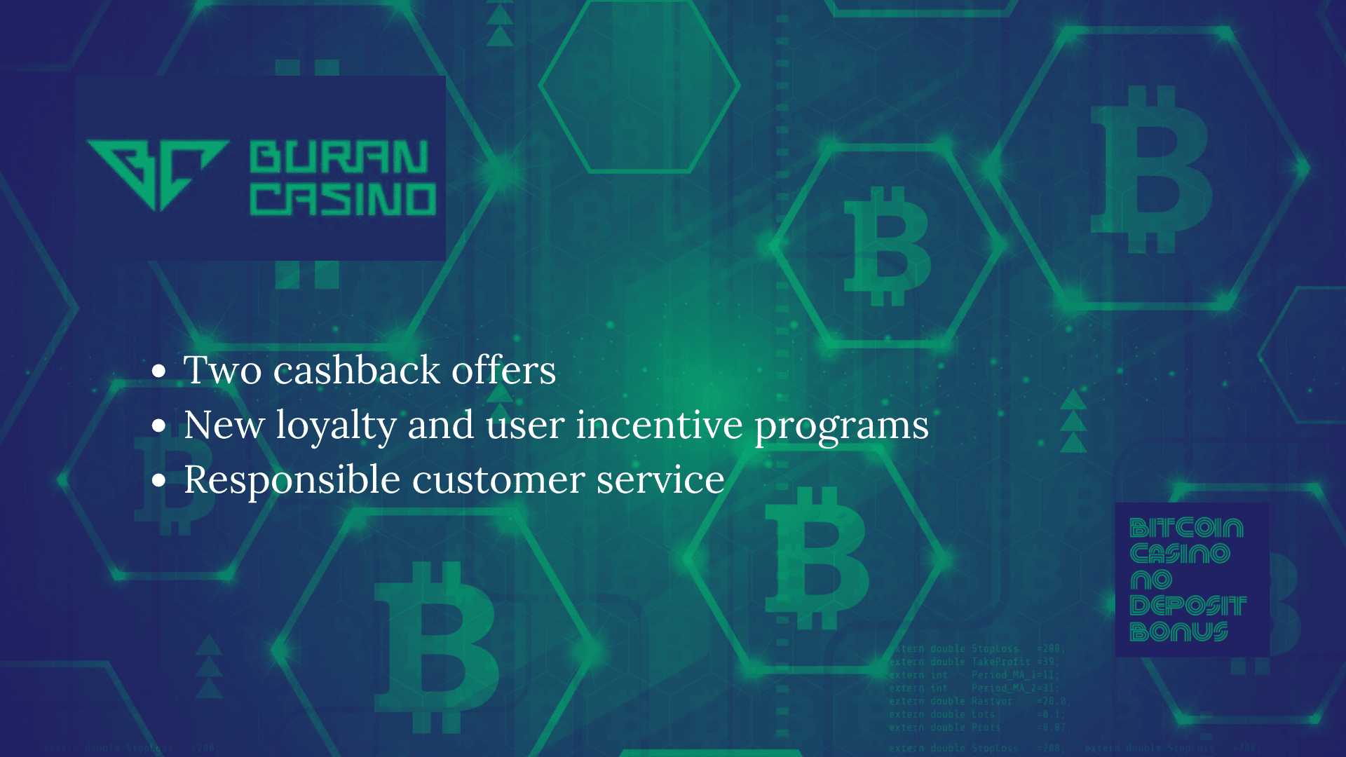 Toda semana, os jogadores podem reivindicar um bônus semanal de reembolso do Buran Casino. É elaborado com as perdas que um jogador ocorre toda semana. O valor mínimo que um jogador pode resgatar é de € 5 e o máximo é de € 3000.