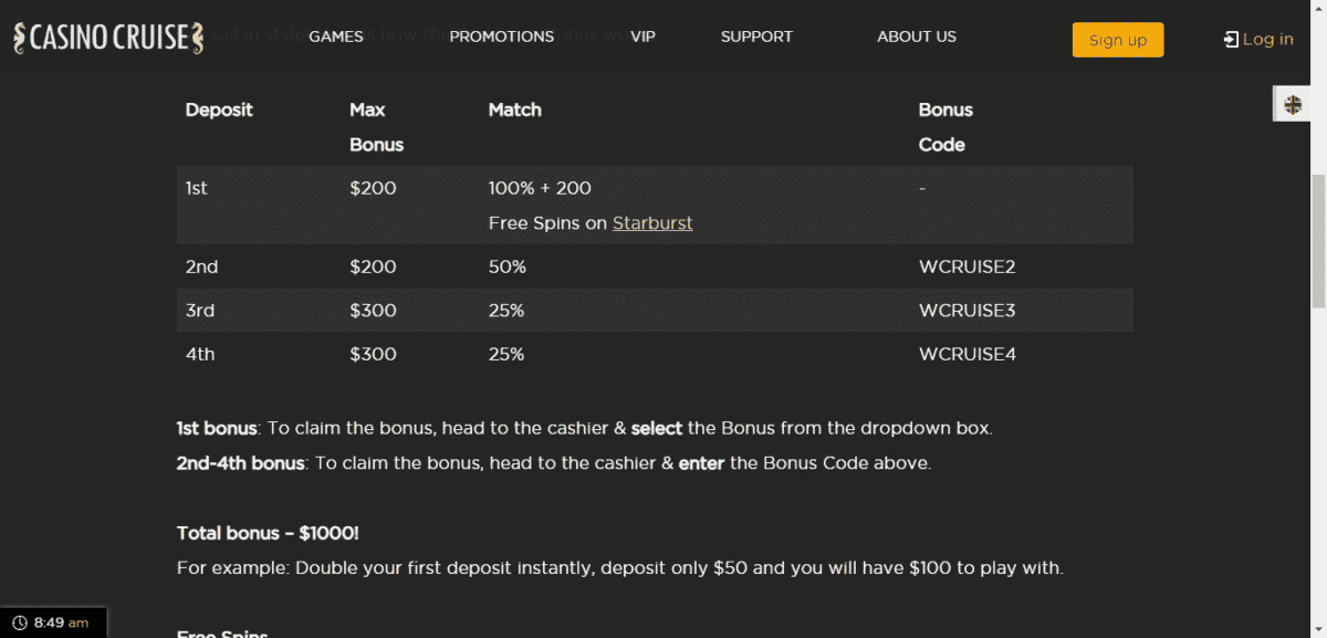 A plataforma de jogos de cruzeiro do Casino sai com seu pacote e promoções de boas -vindas. Os iniciantes adorarão o pacote de boas-vindas de US $ 1.000 que é dividido nos quatro depósitos iniciais, juntamente com 200 rodadas gratuitas como um deleite.