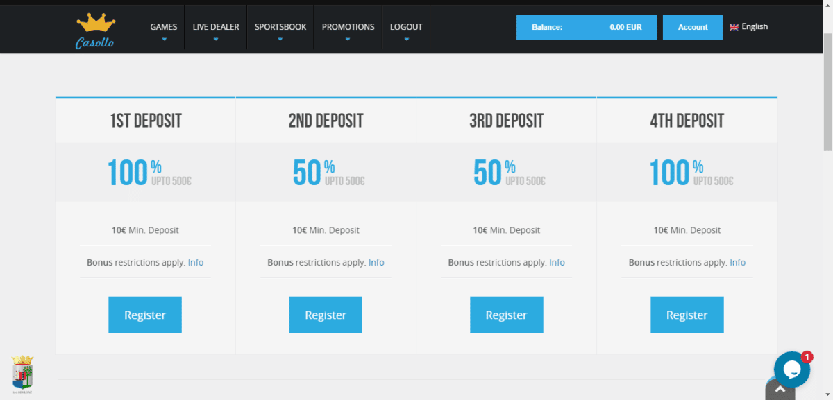 No site do Casollo Casino, o bônus de boas -vindas para agosto de 2022 consiste em 4 bônus de depósito de correspondência que cobrem € 2000. No entanto, para ganhar esse valor de bônus, os apostadores devem fazer um depósito mínimo de € 10 para todos os quatro depósitos. Eles também são obrigados a atender à demanda de 35x. Casollo Termos e condições do cassino Também exija que os jogadores joguem por seus depósitos e valor de bônus, uma condição que aumenta o requisito de apostas para 70x. Eles são quebrados da seguinte maneira: