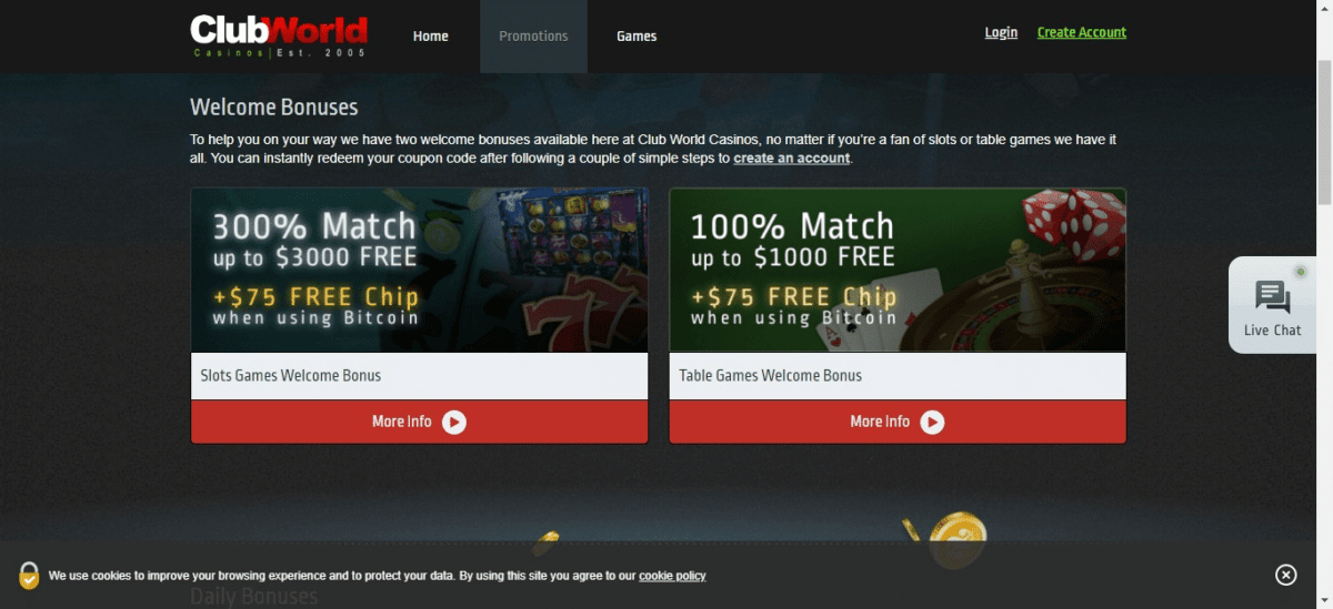 Através do bônus do Club World Casino, os jogadores jogam slots, jogos de arranhões e Keno. Nesse momento, outras opções não estão disponíveis para os jogadores até que sejam feitos com o bônus.