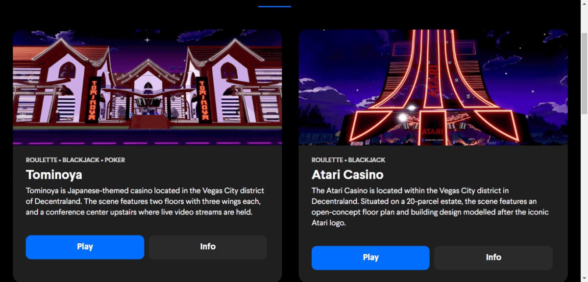 Atualmente, existem cinco cassinos para escolher na Decentral Games, todos localizados em uma área conhecida como Vegas City, que é acessível a partir da parte noroeste do Decentraland Genesis Plaza.