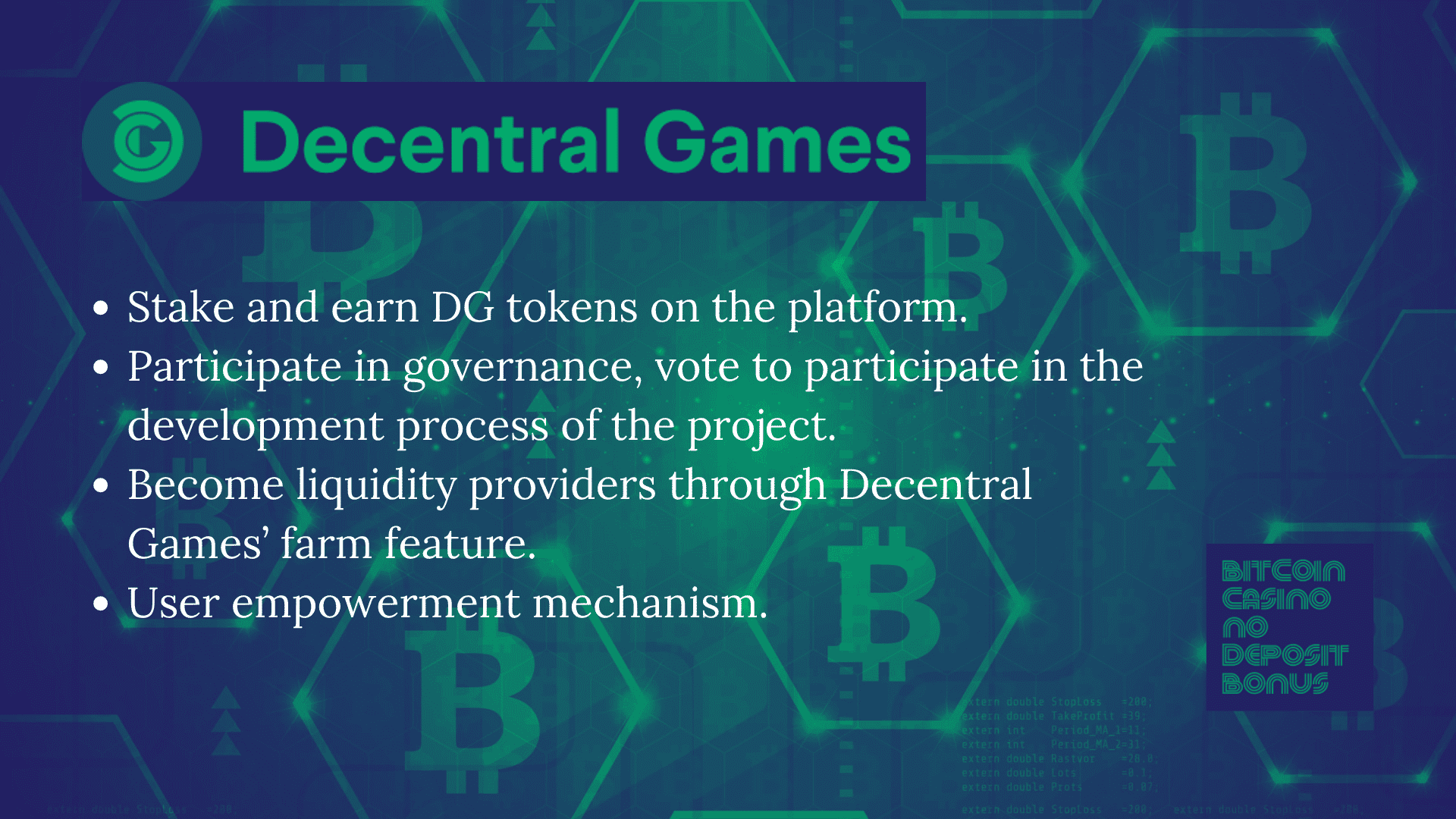 A Decentral Games criou um ecossistema on -line inteiro com tokens DG que permite que os jogadores dêem sua opinião sobre como o cassino deve funcionar fornecendo idéias e votação. Existem muitas maneiras de ganhar tokens da DG, incluindo mineração, apostar e simplesmente jogar os jogos disponíveis.