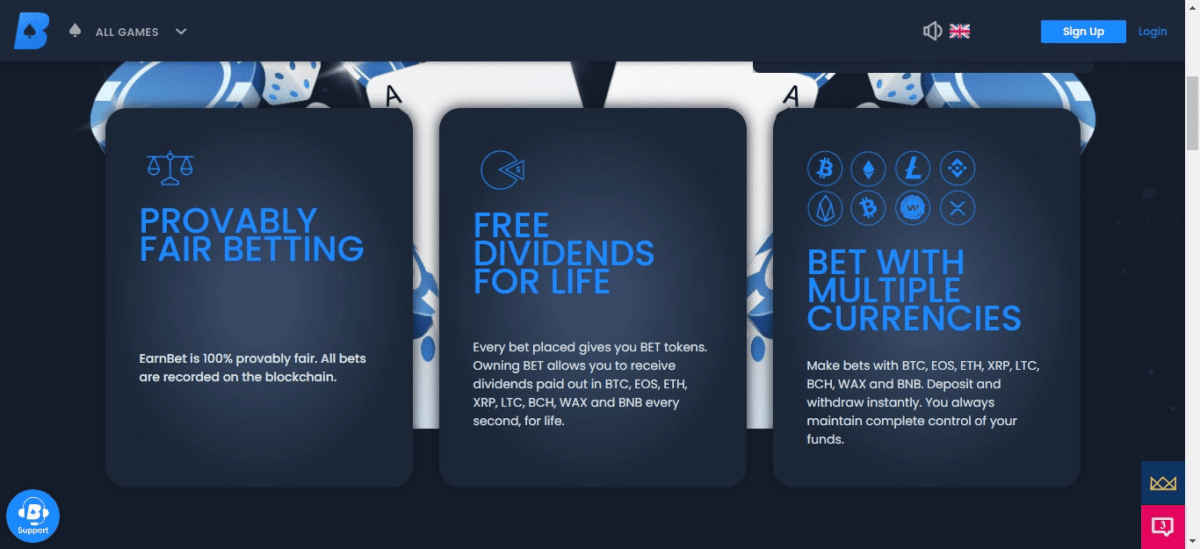 O Earnbet se promove como 100% provável, com todas as apostas registradas no blockchain como prova. Todos os jogos são criados pelo Earnbet, o que significa que você não os encontrará em nenhum outro lugar! Apesar de ter um catálogo bastante pequeno de jogos, todos são originais e divertidos e têm bordas decentes da casa, que são exibidas antes de você jogar o jogo por transparência. Os jogos incluem Blackjack, Baccarat, Dice, Hilo, Crash e Jackpot.