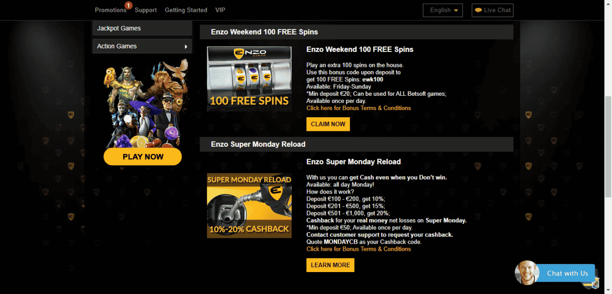 Os jogadores que têm a chance de entrar em contato com o departamento de atendimento ao cliente do Enzo Casino podem solicitar um bônus especial. Muitas vezes, os jogadores recebem um código de bônus que carrega qualquer coisa, desde rotações gratuitas adicionais a bônus de reembolso único.