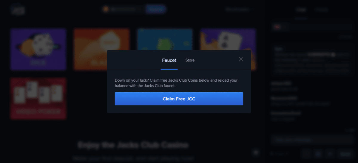 Para começar a receber seu JCC gratuito, você deve primeiro compartilhar o Jacks Club em uma plataforma de mídia social de sua escolha. Depois de fazer isso, você pode começar a reivindicar suas moedas gratuitas todos os dias clicando na opção "Faucet" no menu suspenso no nome da sua conta.
