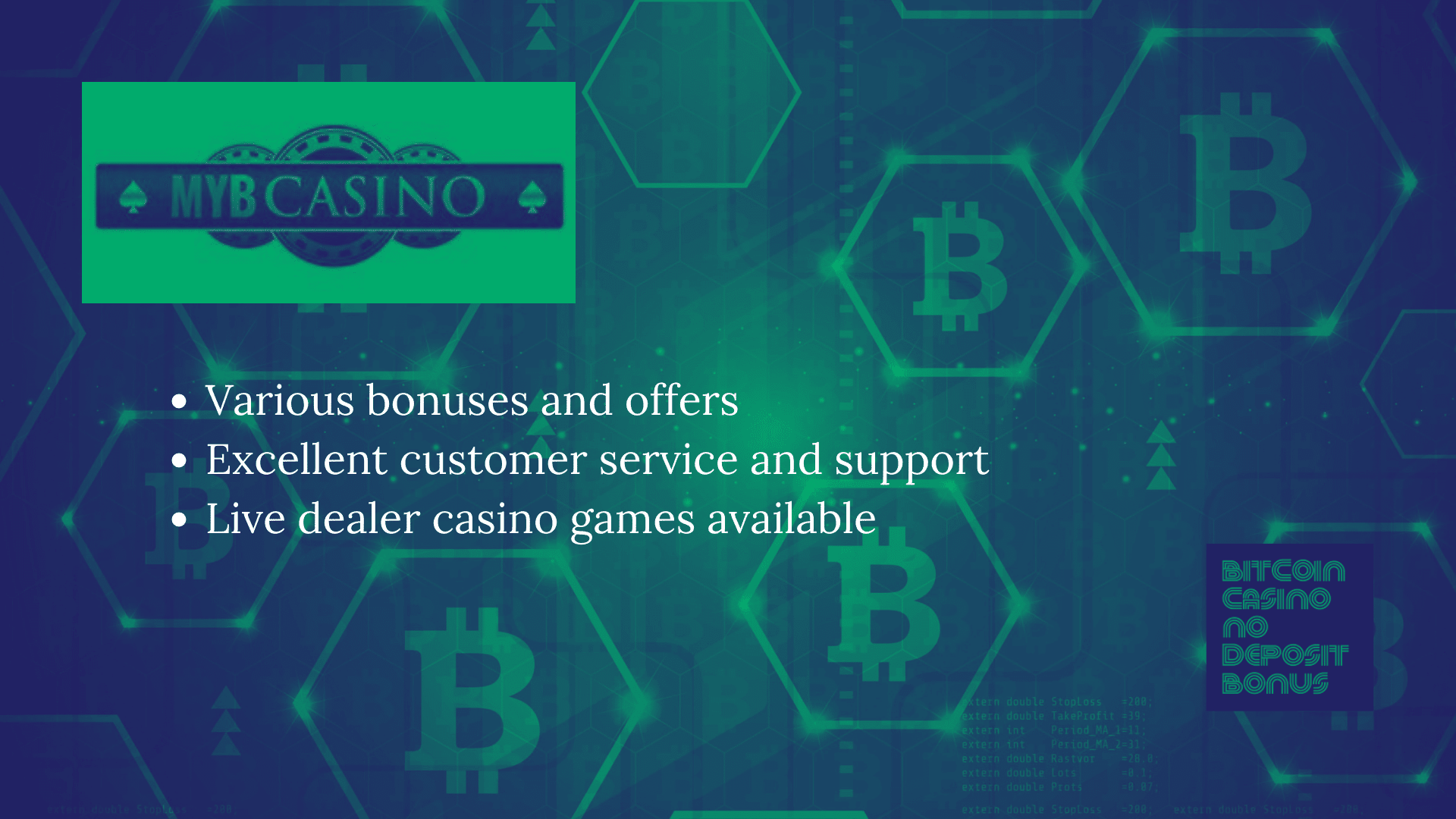 O MYB é um bom cassino online tradicional que aceita Bitcoin e dinheiro real. É licenciado e fornece jogos dos melhores provedores de software do mundo e possui termos favoráveis a apostas.