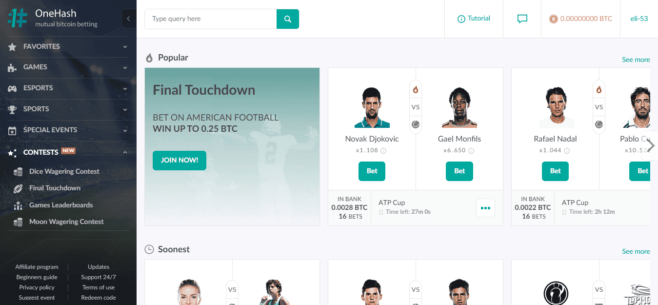 Onehash é uma plataforma feita pelos entusiastas do Bitcoin para fãs de esportes e esports e muito mais. Dá bônus duplo até 0,1 BTC para o primeiro depósito pago em parcelas de 10% de cada aposta feita no site com multiplicador maior que X1.100.
