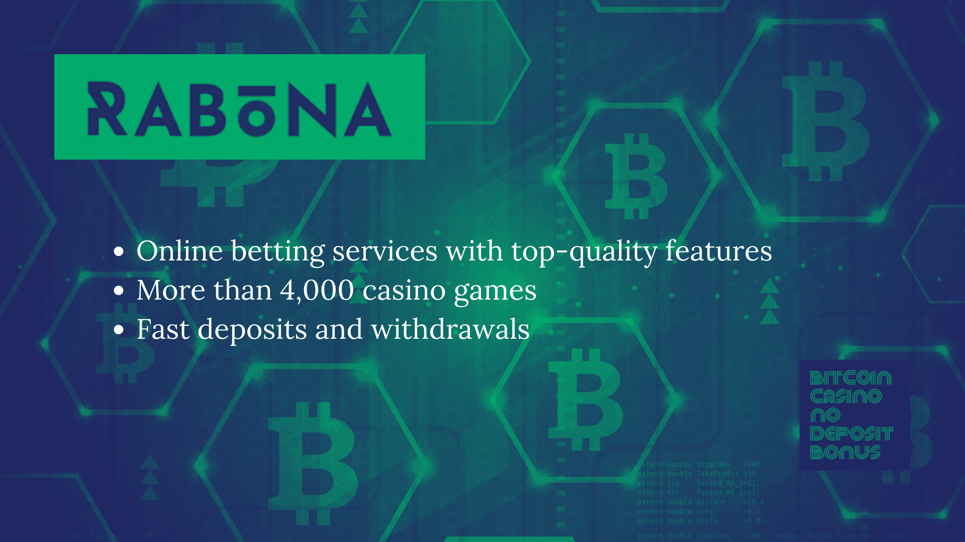 Rabonacasino é um fantástico cassino geral que entrou na incursão em 3 de agosto de 2019. A plataforma concede aos jogadores tudo o que começam com slots, Sportsbook, ao Live Casino. O cassino pertence e é operado pelo grupo de empresas Tranello.