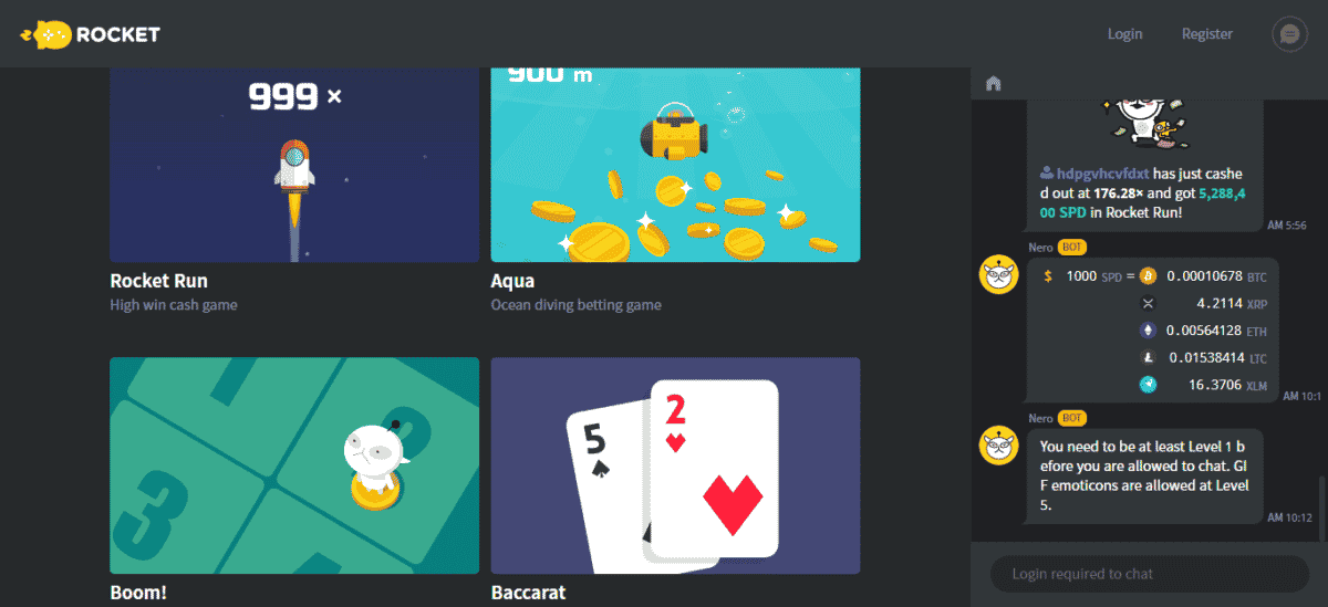 Embora não haja oferta de boas -vindas em si, ao criar uma conta no Rocket Run, você começará imediatamente com 300 SPD. O SPD (dólares do espaço) é um altcoin exclusivo desenvolvido pela Rocket Run para uso especificamente em seu cassino.