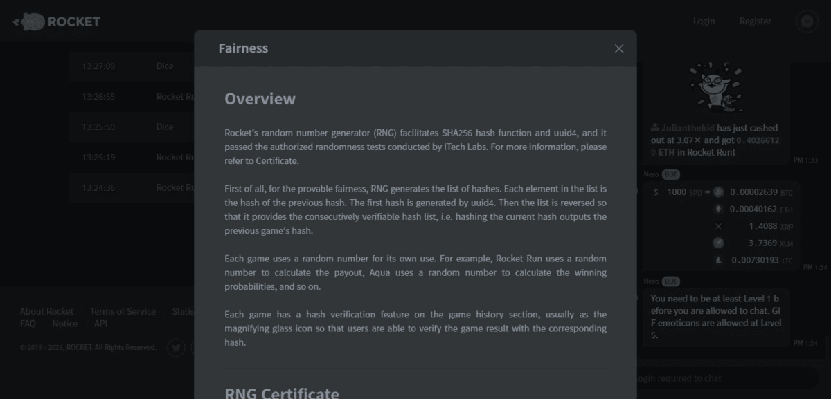 Como a maioria dos jogos da Rocket Run é desenvolvida internamente, não há problema com a justiça. Eles orgulhosamente exibem dois certificados na parte inferior de todas as páginas; Um da Crypto Gambling Foundation, verificando o Rocket Run como um operador justo e também um da Itech Labs, certificando que o RNG (gerador de números aleatórios) oferece resultados verdadeiramente aleatórios semelhantes aos mesmos jogos na vida real.