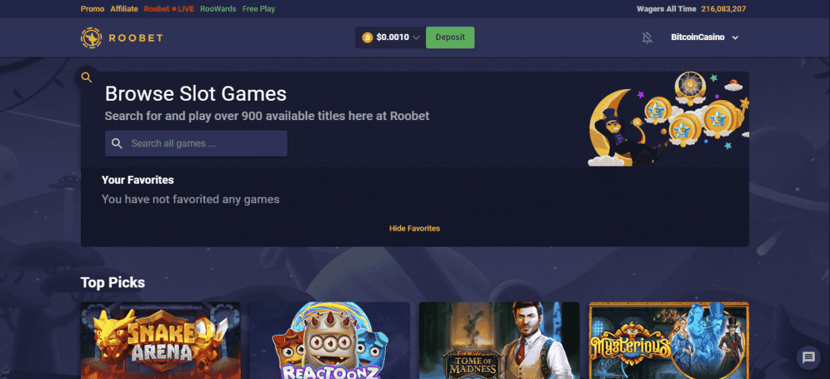 Ao contrário de muitos dos principais cassinos online, o Roobet tem um depósito mínimo muito baixo. Não há valor mínimo ou máximo de depósito ao depositar dinheiro no BTC! No entanto, há um depósito mínimo de 0,001 LTC ou 0,001 ETH.