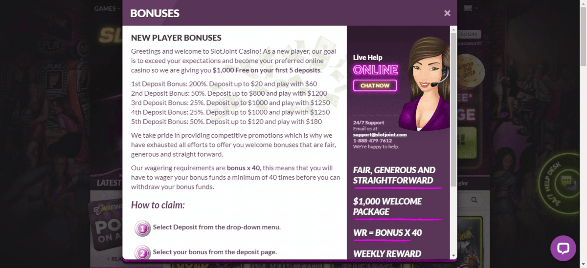 Depósitos e retiradas são gratuitos e o Slotjoint Casino tem orgulho de que nunca bloqueie os fundos dos apostadores, permitindo que eles façam saques a qualquer momento. O sistema de suporte ao cliente está a apenas um botão, que é permanentemente colocado no lado direito da página inicial.