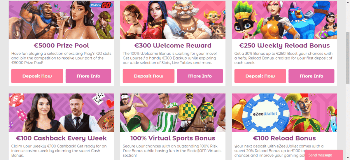 Os novatos ficarão felizes em saber que o primeiro bônus de depósito neste cassino é usado para jogar inúmeros slots e jogos. Além disso, o bônus gratuito do Slottojam para agosto de 2024 foi projetado para atrair depositantes pequenos e grandes. As duas semanas que passamos neste site foram esclarecedores, e nossos revisores recomendam que você tente jogar neste site.