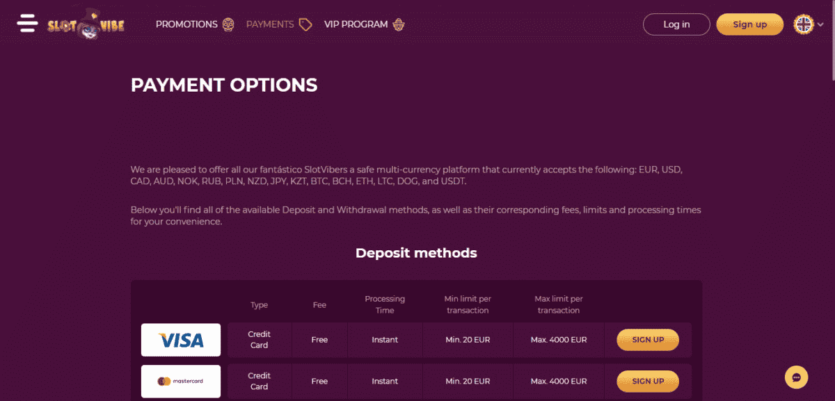 O pagamento é aceito em uma ampla variedade de moedas e métodos na Slotvibe. Acabou de abrir e já se estabeleceu como um forte jogo de criptografia, aceitando o pagamento em BTC, BCH, ETH, LTC, DOGE e USDT, os principais altcoins disponíveis hoje.