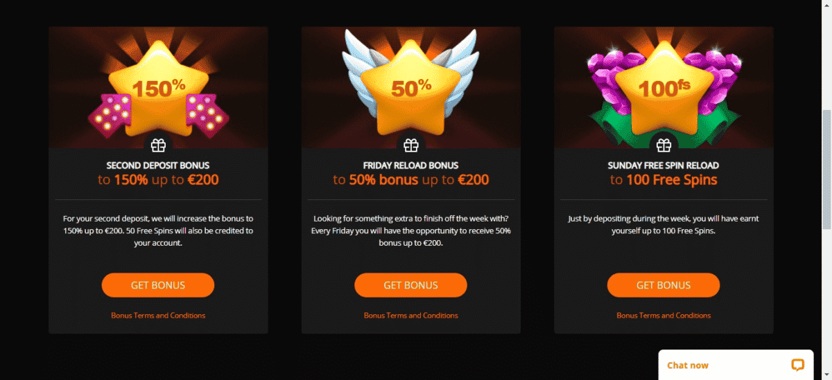 Depois de fazer um depósito inicial, os apostadores acabam recebendo uma oferta de partida com 100% de até € 200. A segunda oferta de depósito atrai 150% até € 200. Os jogadores também recebem muitas rodadas gratuitas, onde 100 rotações gratuitas são concedidas após o primeiro depósito, e cinquenta rodadas são dadas após fazer um segundo depósito.