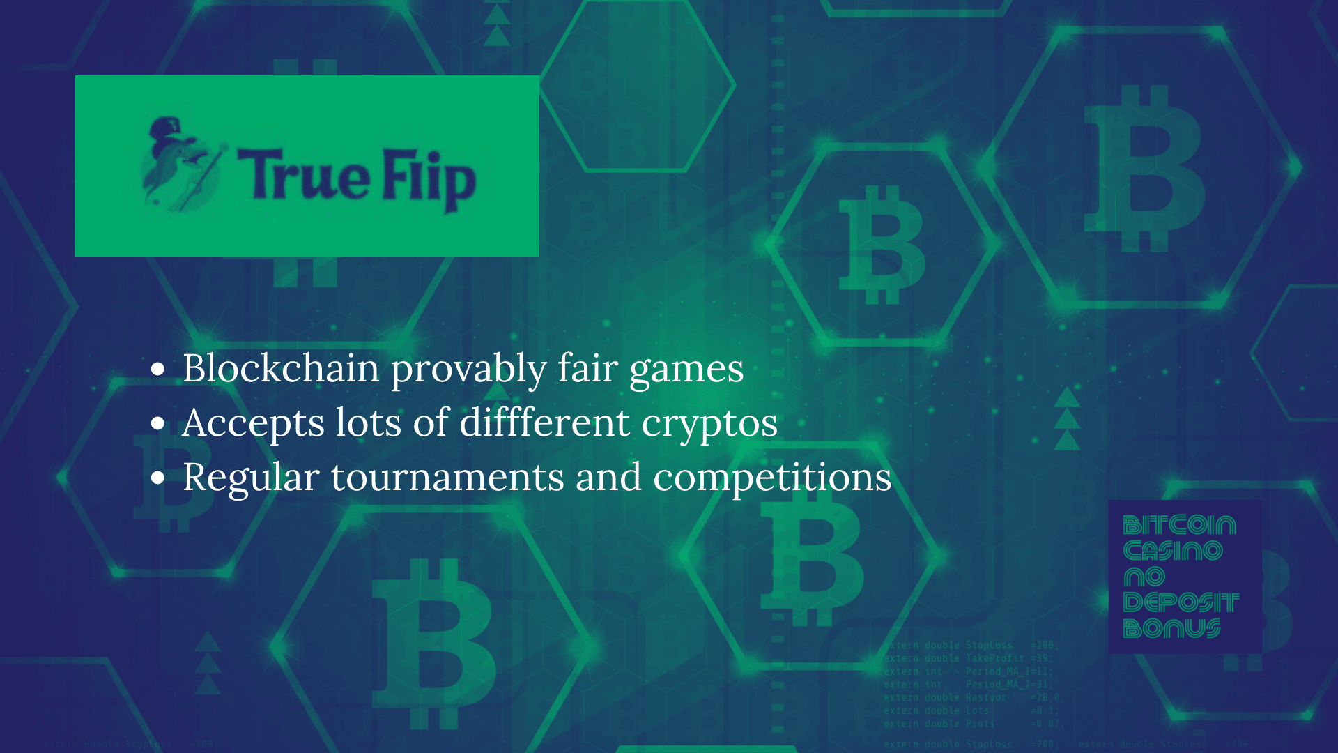 O bônus Trueflip Free está disponível até 40 MBTC ou para jogadores que desejam depositar usando dinheiro real, o valor é de 200 EUR. Há também muitos únicos Código promocional Trueflip Ofertas que fornecem maneiras de ganhar o BTC para jogar.