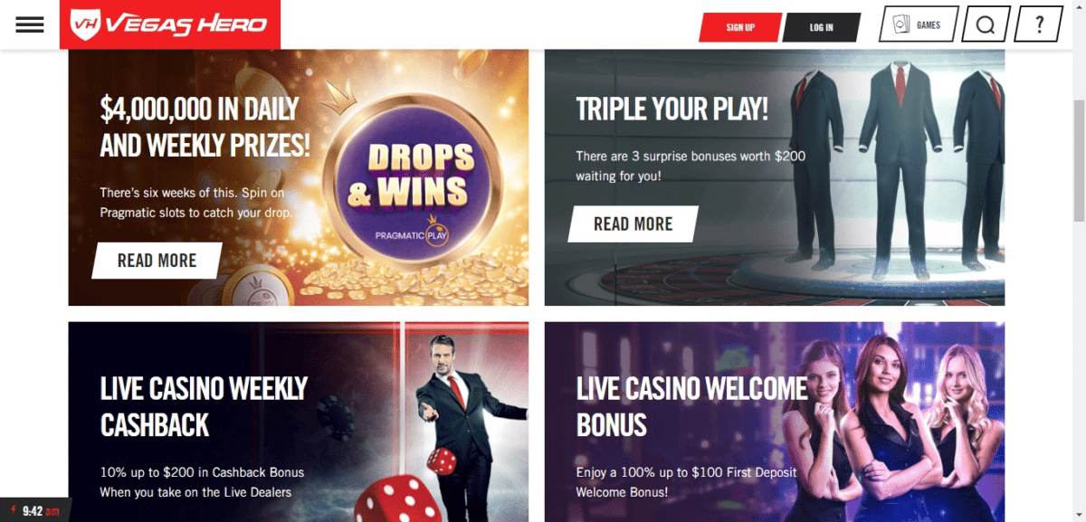 Também existem 'Drops e vitórias diários' regulares nos slots de Vegas Hero, com US $ 4.000.000 em disputa como prêmios diários e semanais.