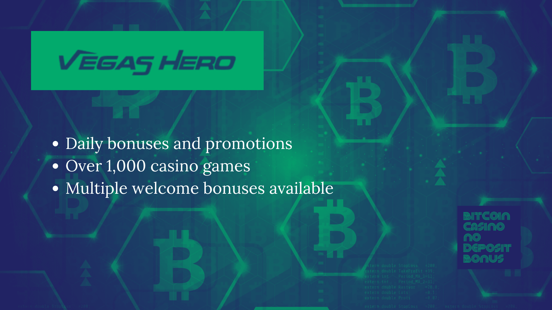 Para o seu primeiro depósito no Vegas Hero, você receberá um bônus de 100% de até US $ 100 mais 50 rodadas grátis. Essas rodadas gratuitas virão como parcelas diárias de 10 rodadas gratuitas todos os dias nos seus primeiros 5 dias. As rodadas gratuitas podem ser usadas no Starburst, Gonzo's Quest e Twinspin.