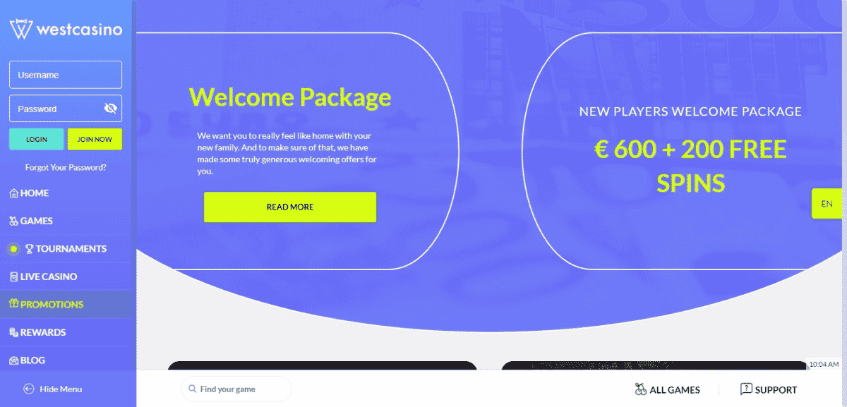 O bônus de giros gratuitos do West Casino, dado após fazer um depósito, está sujeito a 35x os requisitos de bônus e valor do depósito.