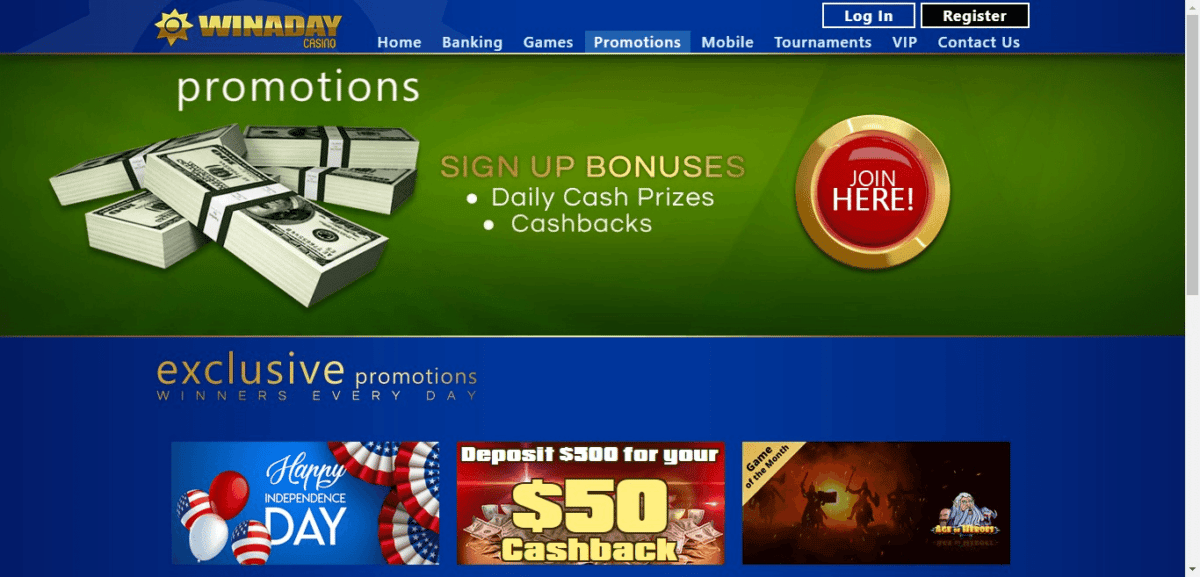 Win A Day Casino fornece vários bônus de boas -vindas altamente lucrativos que são muito mais valiosos do que os encontrados em outros cassinos online. A maioria dos bônus exige que um depósito seja feito primeiro. No entanto, conseguimos garantir um exclusivo Bônus sem depósito de cassino Winaday Vale US $ 30, disponível apenas através de nós.